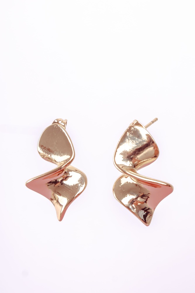 Impactantes aretes colgantes con diseño escultórico en acabado dorado espejo. Su forma abstracta y fluida aporta una elegancia artística que convierte cualquier look en una declaración de estilo.